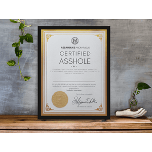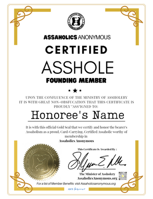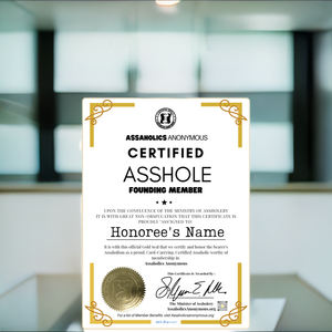 Picture this: The Official Limited-Edition Digital Certified Asshole Membership Certificate. Instant laughs, my fellow Assaholics! Print it, frame it, hang it—boom, immediate laughter, immediate masterpiece. Become a Founding Member of Assaholics Anonymous and relish in the perks, like 10% off and more free shipping than you can shake a stick at. For a full list of benefits click here, but trust me, the laughs alone are worth it!