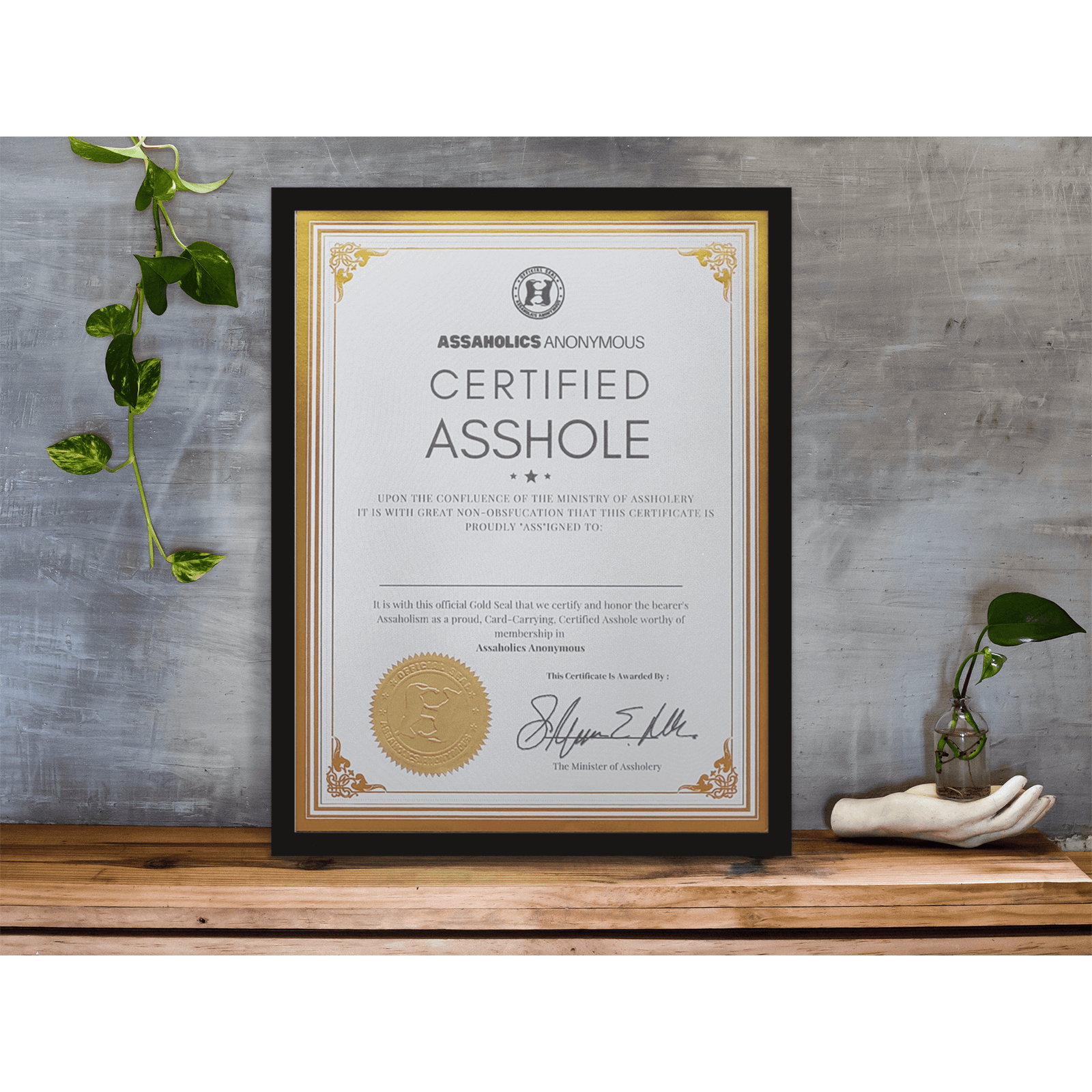 On a budget or just need it fast, you can order a digital version of the Certified Official Founding Member of Assaholics Anonymous Certificate. Bestowed by the Minister of Assholery, you are then also vested with the powers to make anyone in your world an "Associate" Certified Member.